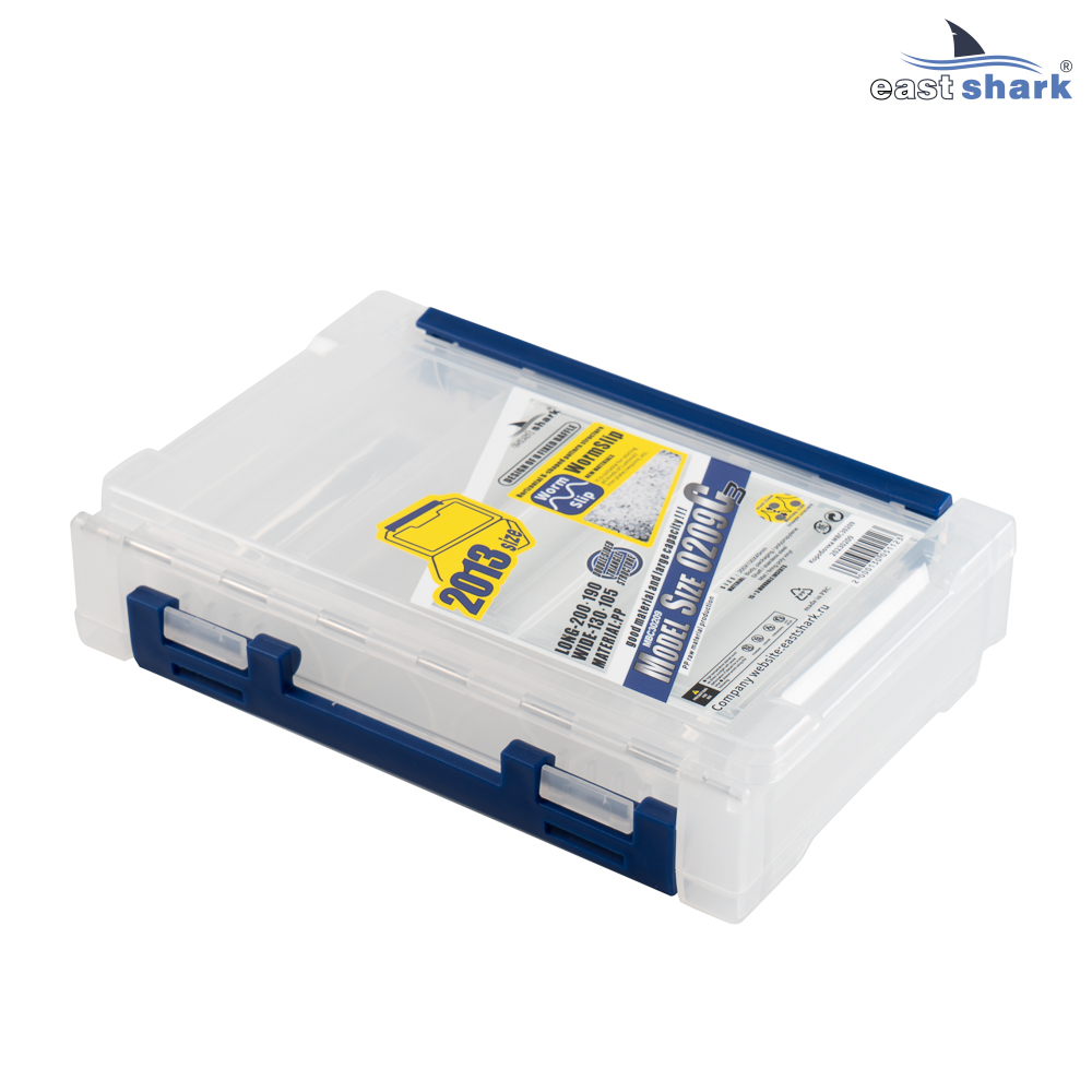 Коробочка EastShark приспособлена для хранения воблеров, с разной длиной до 100 мм. Коробка 2-х сторонняя, имеет по 5 ячеек для приманок с каждой стороны. Крепкий PP пластик, надежные замки. Размер коробки 200*130*45 мм.