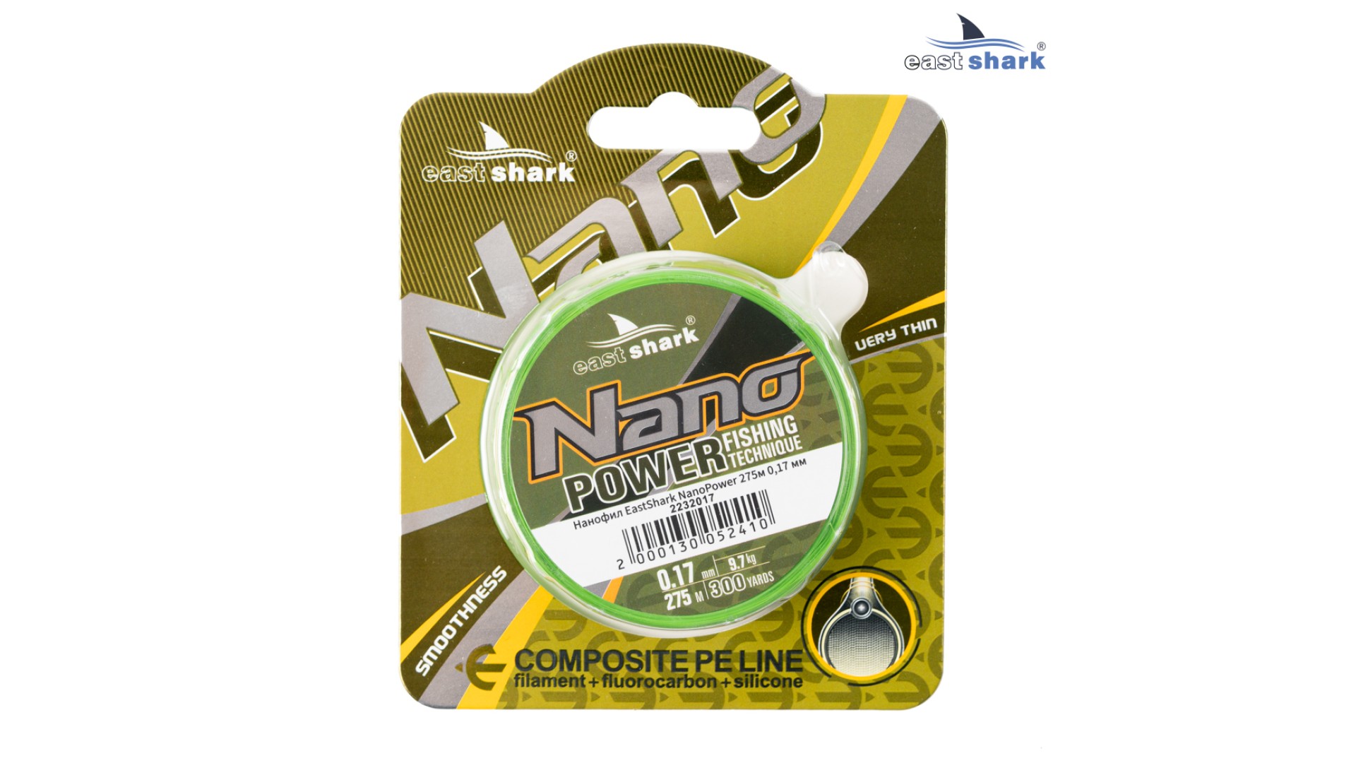 На российском рынке она появилась сравнительно недавно, но уже успела завоевать доверие многих рыболовов. EastShark NANOPower представлена в разных диаметрах – от 0.12 до 0.20 мм - и разной прочности на разрыв - от 6,9 до 12,6 кг.
