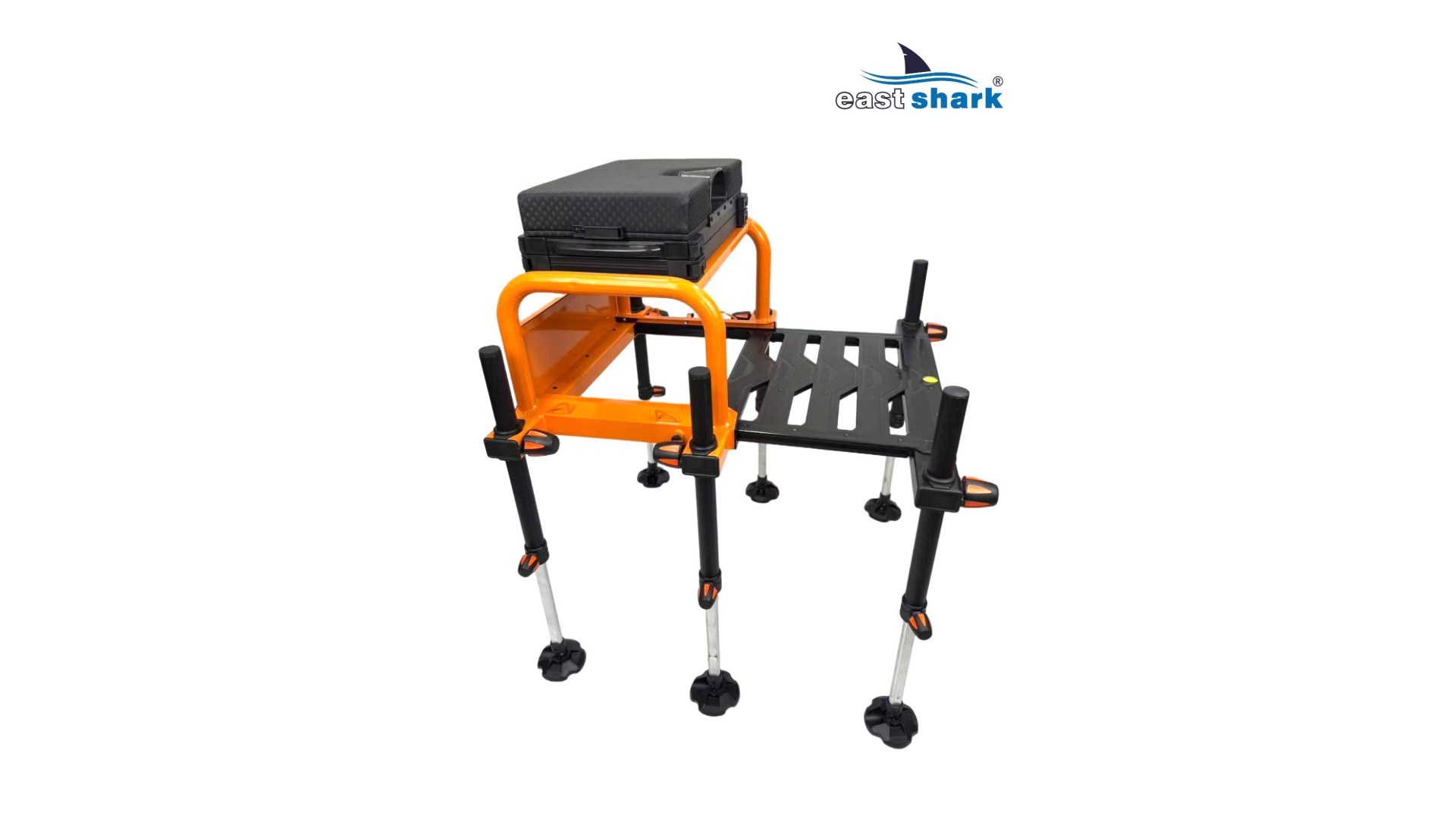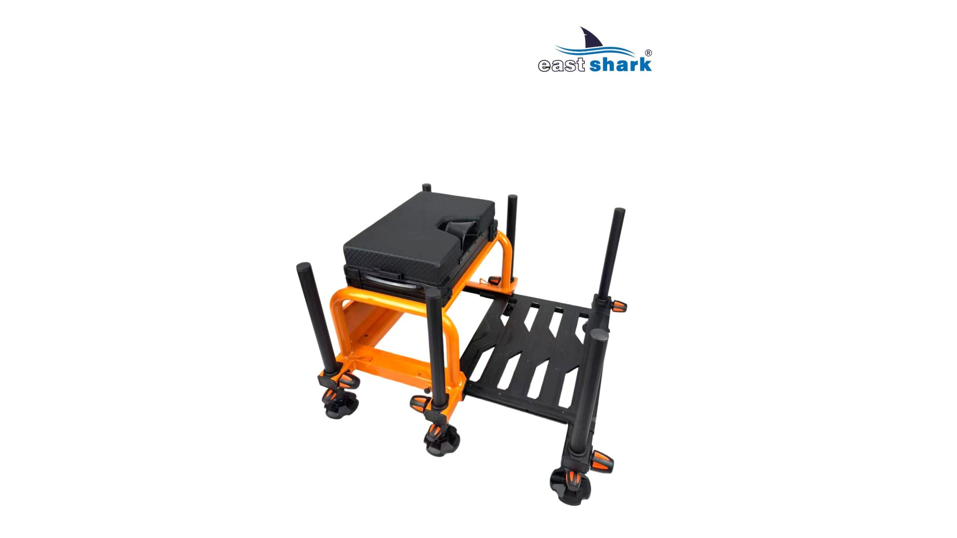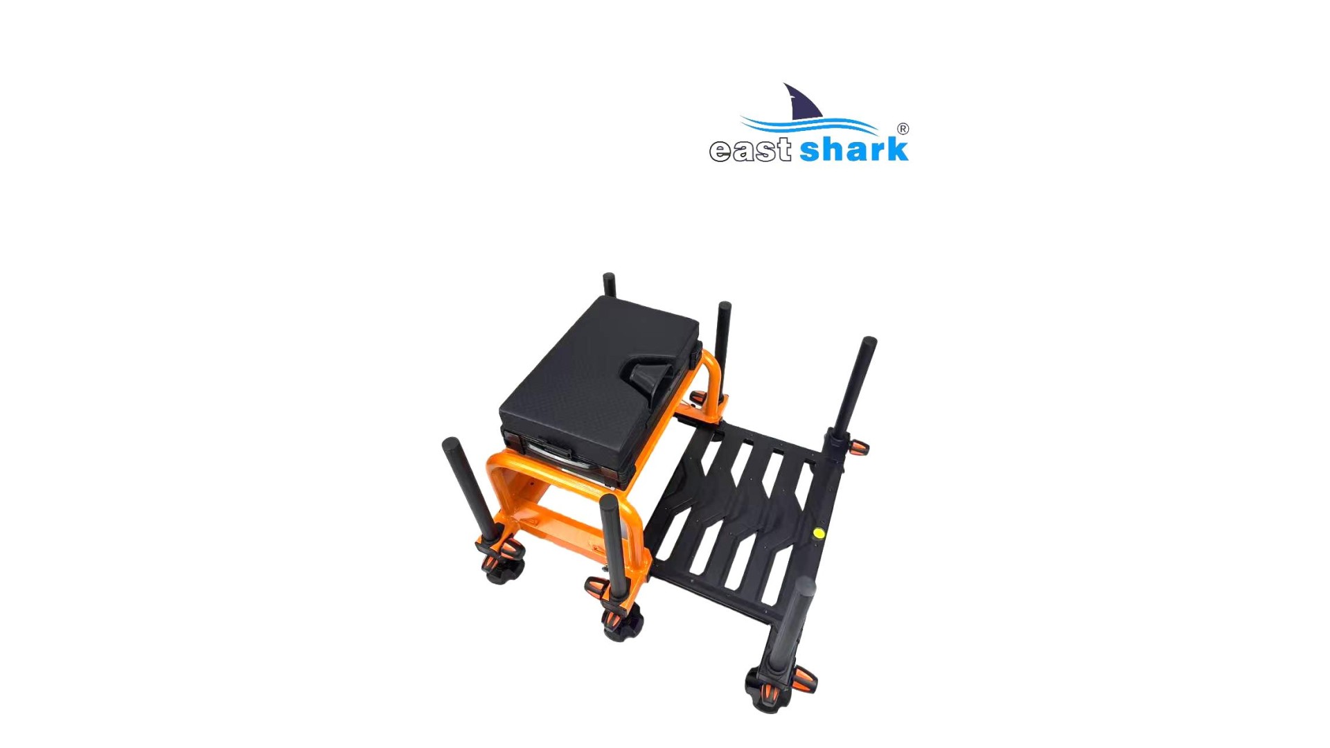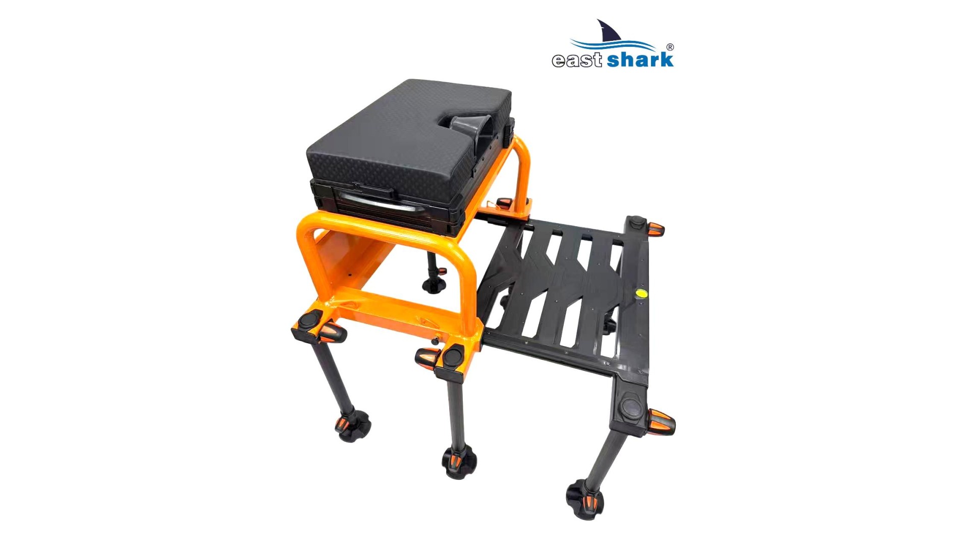 Высококачественная современная, футуристическая, профессиональная платформа с верхней полки известной и уважаемой компании Eastshark Изготовлен из легкого и сверхпрочного дюралюминия, покрытого неабразивной краской черного и оранжевого цвета. Конструкция площадки основана на закрытых дюралюминиевых профилях