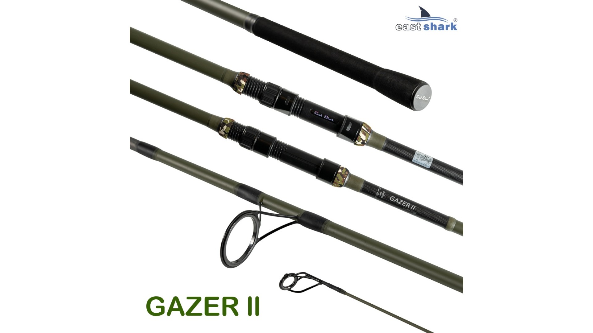 Серия карповых удилищ Gazer 2 от EastShark включает в себя рабочие бланки с тестом 3,75LB в длине 3.6 и 3.9 м, мощные бланки с маркировкой SPOD, с тестом 5,0 LB для прикармливания или ловли на течении с большими весами грузов длиной 3.6 и 3.9 м. А так же, Gazer 2 представлен в двух и трёх частном исполнении.